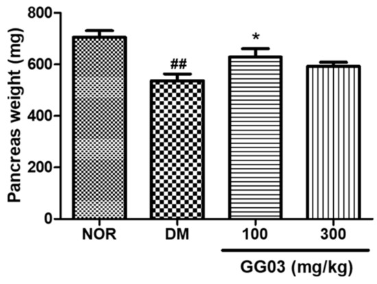 The pancreatic weights of the DM group were lower than those of the NOR group, and the GG03 100-treated group had higher pancreatic weights compared to the DM group. However, pancreatic weights in the GG03 300-treated group were not significantly different to those of the DM group (Figure 9).