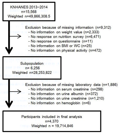 The Korean National Health and Nutrition Experimental Survey (KNHANES) is a nationwide, population-based, cross-sectional study of the health and nutritional status of South Korean residents. The Korea Centers for Disease Control and Prevention (KCDC) conducts the survey to gather sociodemographic information, anthropometric measurements, laboratory data, a health questionnaire, and nutrition information. The KNHANES data are publicly available []. Written informed consent was obtained from each participant in KNHANES at the time of enrollment. We performed this study in accordance with the Declaration of Helsinki. This study was approved by the IRB of Chonnam National University Hospital (IRB No. CNUH-EXP-2019-157). The target population of KNHANES was drawn using a multi-stage, stratified, and clustered probability sampling design. In each year, 192 primary sampling units (PSUs) were selected from about 200,000 geographically defined PSUs nationwide. A PSU includes about 60 households, and 20 households were systematically sampled from each PSU. In the sampled households, participants aged one year or above were selected. All the statistics of KNHANES were calculated using sample weights allocated to sample participants. The weights were set for sample participants to represent the whole Korean population. The weights based on the inverse of selection probabilities and inverse of response rates were modified by post-stratification with sex and age []. We retrospectively analyzed data of 15,568 participants from the KNHANES 2013–2014. After weighting by complex samples design, 15,568 participants representing 49,866,308.5 South Koreans were considered for the study [,,,]. According to Statistics Korea, the population of South Korea was 48.580 million in 2010, and 51.069 million in 2015 []. Participants aged below 19 years or older than 64 years were excluded, because the nutrition survey was implemented for participants aged between 19 and 64 years old. We excluded participants who did not answer the entire questionnaire or could not undergo the laboratory tests. A total of 4370 individuals representing 19,714,846 persons were included (Figure 1). This represents 39.5% of the total estimated Korean population, and 58.3% of the estimated population aged between 19 and 64.
