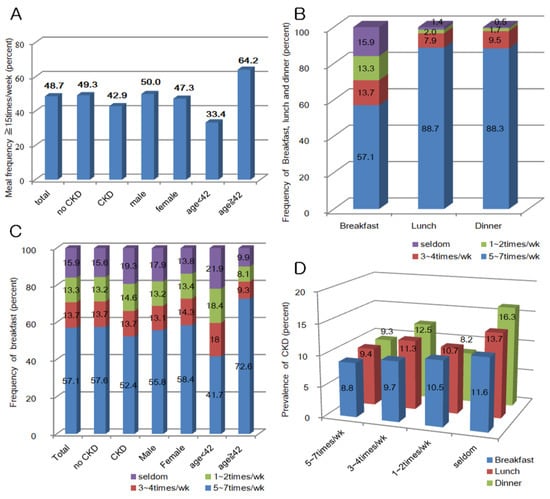 (A) Meal frequency at least ≥ 15 times/week; (B) frequency of breakfast, lunch and dinner; (C) frequency of breakfast by chronic kidney disease (CKD), gender, and age (years); and (D) prevalence of CKD by the frequency of breakfast, lunch, and dinner.