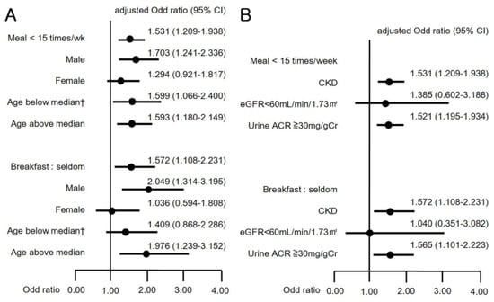 We found a few differences in the subgroup analyses by gender, age, and the categories of CKD by eGFR or albuminuria. Men showed a higher risk of CKD with low meal frequency; however, women did not. Men or persons aged above 42 years had higher risks of CKD due to breakfast skipping; however, women or persons below 42 years did not. Low meal frequency or breakfast skipping affected the prevalence of CKD as an increase in albuminuria, but not as a decrease in eGFR.