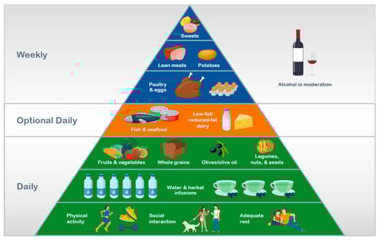The Mediterranean diet is based on components of the traditional dietary patterns of Euro-Mediterranean countries and encompasses not only the types of foods consumed and their relative contributions to daily nutrient intake, but also an approach to eating that is cognizant of how foods are sourced (e.g., sustainability and eco-friendliness), cooked, and eaten, as well as lifestyle considerations such as engaging in regular physical activity, getting adequate rest, and participating in fellowship when preparing and sharing meals []. Within the core framework of the Mediterranean diet, variations based on geography and culture are reflected in the emphasis on the inclusion of traditional and local food products. The primary basis of daily meals in the Mediterranean diet is cereals such as whole-grain bread, pastas, couscous, and other unrefined grains that are rich in fiber and a variety of fruits and vegetables of different colors and textures that are high in micronutrients, fiber, and phytochemicals (Table 1) [,,,,,]. Dairy products, preferably low-fat yogurt, cheese, or other fermented dairy products, are recommended daily in moderation as a source of calcium, which is needed for bone and heart health. Olive oil serves as the primary source of dietary lipids and is supplemented with olives, nuts, and seeds. Water (1.5–2.0 L/day or ~8 glasses) is recommended as the main source of hydration, whereas wine and other fermented alcoholic beverages are generally permitted in moderation, to be consumed with meals. Fish, white meat, and eggs are the primary sources of protein; red meat and processed meats are consumed less frequently and in smaller portions. Legumes are also a preferred source of plant-based proteins [].