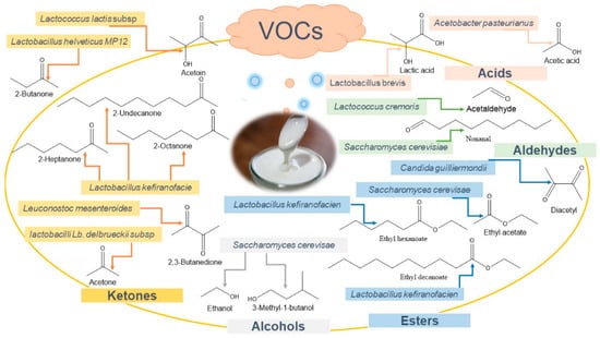 The starter culture employed in kefir production exhibits a significant effect on its viscosity and on chemical composition []. The kefir microbial community encompasses a complex mixture of lactic acid bacteria (LAB) (Leuconostocs, Lactobacilli, Streptococci, lactococci, Enterobacter, Acinetobacter, Enterococcus, and Pseudomonas spp.), acetic acid bacteria and yeasts (Kluyveromyces, Candida, Torulopsis, Saccharomyces, Rhodotorula and Zygosaccharomyces) (Table 1) [,]. Yeast plays a vital role in establishing an environment that allows for the growth of kefir bacteria, aside from the production of several key metabolites such as peptides, amino acids, vitamins, ethanol and CO2 that contribute ultimately to kefir’s flavour and aroma [,] and its several health benefits. In Brazil, kefir grains are used to ferment milk in private households. Brazilian kefir is characterized by the presence of three microbial populations: yeast (Saccharomyces cerevisiae), lactic acid bacteria and gram-negative bacteria (Lactobacillus paracasei) to yield kefir with lactic acid, alcohol and acetic acid. Chemical analysis revealed that the highest concentration of lactic acid (7.30 mg/mL), followed by acetic acid (6.50 mg/mL) and malic acid (4.00 mg/mL) is observed in cow milk kefir fermentation []. The increase in lactic acid bacterial population was found to be correlated with an increase in lactic acid levels [], and aside from imparting the unique taste in kefir, lactic acid inhibits microorganism growth owing to decrease in pH acting as an acidulant preservative. In contrast, yeast (S. cerevisiae) mediates for aroma production in kefir alongside other volatile esters such as isopentyl acetate, ethyl hexanoate, ethyl octanoate, phenethyl acetate, and ethyl decanoate [,]. Esters are recognized for their distinctive aroma in many herbs and appear to be responsible for the predominant aromas in kefir. Tibetan kefir is characterized by Lactobacillaceae, Streptococcaceae and Leuconostocaceae families []. In the manufacture of Tibetan kefir, a combination of different microorganism species from Lactococcus lactis, Leuconosroc mesenteroides, Lactobacillus kefir, Lactobacillus casei, and Kluyveromyces marxianus are employed and produce diacetyl, ethanol, and CO2 at 77.23 mg/L, 4259 mg/L, and 2.12 g/L, respectively (Table 1) [].