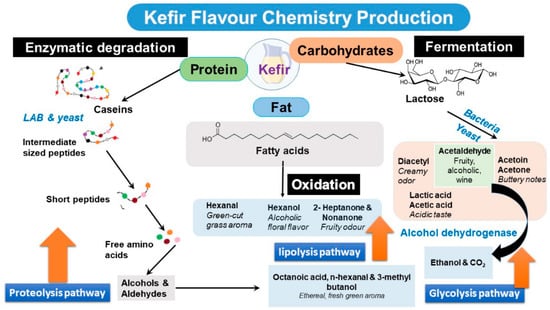 Kefir flavour chemistry production via proteolysis, lipolysis and glycolysis of milk macronutrients by the action of different microbes within kefir grains.