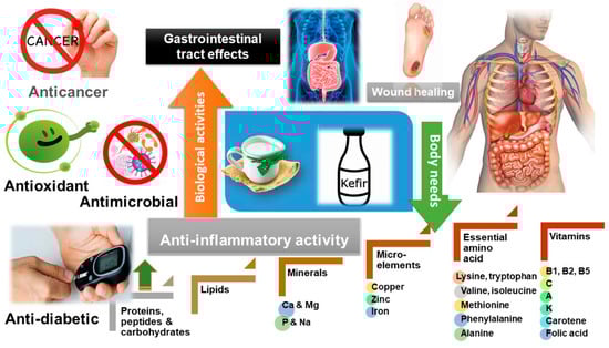 The number of fermented dietary supplements in the market has recently increased, owing to increased health awareness and lifestyle changes supporting (supposedly) healthy foods worldwide []. The nutritional values of kefir are due to its rich chemical composition, including minerals, sugars, carbohydrates, proteins, peptides, vitamins and fats (Figure 5). Aside from such chemical makeup, it is the fermentation process that further enhances kefir’s nutritional value owing to secondary bioactive ingredients such as catechin, vanillin, ferulic acid, and salicylic acid. The latter has been identified in kefir produced from peanut milk []. Kefir is enriched in vitamins B1, B2, B5 and C, minerals and essential amino acids that are of value for improving fitness, the healing process and homeostasis. The vitamin composition in kefir is affected by the type of milk and microbiological flora used in its production. Propionibacterium peterssoni and Propionibacterium pituitosum produced vitamin B12, whereas Freudenreichii subsp. Propionibacterium Shermanii supported more vitamin B6 production []. Kefir is rich in the amino acids serine, threonine, alanine, lysine, valine, isoleucine, methionine, phenylalanine and tryptophan, which play a major role in the central nervous system. Kefir also contains partially digested proteins (e.g., caseins) that aid in its digestion and absorption by the body []. The essential amino acids found in abundance in kefir also regulate protein, glucose and lipid metabolism and exhibit a positive effect on the regulation of body weight, maintenance of immune response and energy balance. Amino acids prevent disability and prolong the healthy life expectancy of elderly subjects [,], and the branched-chain amino acids that are also found in kefir improve the cognitive recovery of patients with severe traumatic brain injury [].