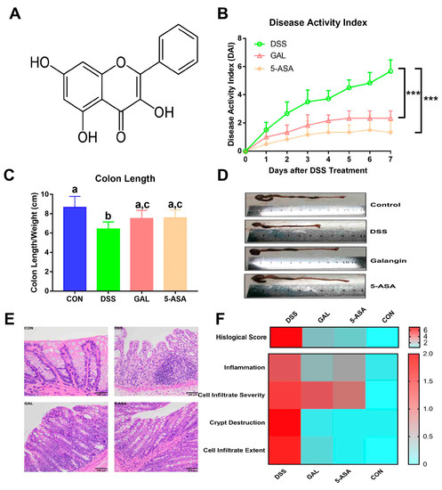 Galangin (GAL) ameliorated acute colitis symptoms induced by dextran sulphate sodium (DSS) in mice. Galangin (15mg/kg, p.o.) were pre-administrated to the mice for 7 days and until the end of the study. DSS (M.W. 36–50 kDa, 3% in tap water) was applied to the animals for 1 week. (A) Chemical structure of galangin. (B) Effects of galangin on the disease activity index, which was described in the Material and Methods. Data are expressed as the mean ± SD (n = 6). Statistic difference between groups was calculated on the basis of repeated-measurement ANOVA. *** p < 0.001. (C) Effects of galangin on colon length changes. Groups with different letters differ by a statistically significant margin (p < 0.05). (D) Representative pictures showed macroscopic features of colon tissues. (E) Representative pictures showed histopathological features of colon tissues. (F) Heatmap representation of histological scores, which includes colonic inflammation, colonic epithelial cell infiltration severity, crypt destruction, and cell infiltration extent. Each row shows one individual index and each column an experimental group. High histological scores are shown in red and low histological scores in blue. CON, control group; DSS, DSS colitis group; GAL, galangin group; 5-ASA, 5-aminosalicylic acid group.