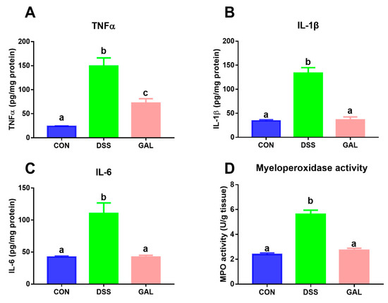 Effects of galangin administration on inflammatory mediators in the colons from DSS-induced colitic mice. (A) Tumor necrosis factor (TNF)-α, (B) interleukin (IL)-1β, (C) IL-6, and (D) myeloperoxidase (MPO) levels in the colonic tissues. The values are expressed as mean ± SD (n = 6). Means sharing the same letter are not significantly different from each other (p < 0.05).