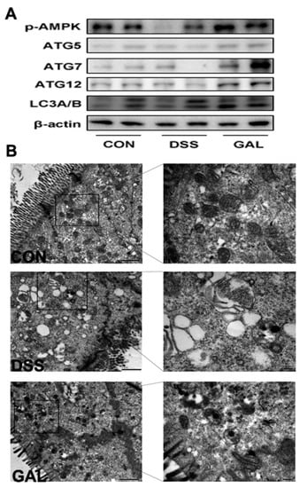 The expressions of autophagy-associated proteins in the colons of DSS-induced colitic mice were assessed. As shown in Figure 3A, it was observed that the autophagy marker proteins, including ATG5, ATG7, ATG12, and LC3B, were downregulated in the colitic mice, compared with the control group. Galangin administration promoted colonic cell autophagy by increasing the aforementioned autophagy-associated proteins. In addition, phosphorylated AMPK expression was decreased in the DSS-treated mice, and this response to DSS was largely reversed following galangin administration. According to TEM analyses, significant epithelial barrier losses were observed in the DSS-treated mice, whereas galangin was shown to significantly induce autophagosome formations in the intestinal epithelial cells.