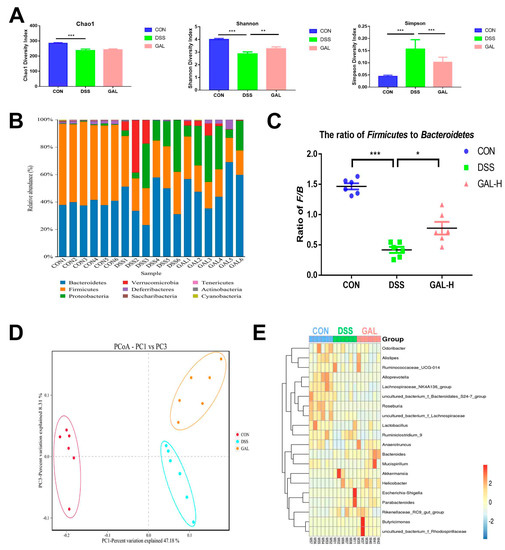 Galangin administration modulated gut microbiota in colitic mice. Mice cecal digesta were collected from the mice for 16S rRNA gene sequencing analysis. (A) Gut microbial α-diversity was calculated on the basis of Chao1, Simpson, and Shannon indices. (B) Gut microbiota composition at the phylum level. (C) The ratio of Firmicutes to Bacteroidetes in the gut microbiota. (D) Gut microbial β-diversity was calculated on the basis of weighted UniFrac metrics and presented as the principal coordinate analysis (PCoA) plot. (E) Heat map of the 20 most differentially abundant taxons among the control, DSS, and galangin groups at the genus level (* p < 0.05, ** p < 0.01, and *** p < 0.001).