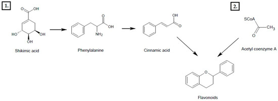 Phenols represent a very important group of antioxidant compounds, widespread among plants [16] that arise as products of plants’ metabolism in the wake of stress, damage, infection, or UV radiation. They are a cohort of compounds of diversified chemical structure emergent in two pathways. In shikimic acid’s transformation, hydroxycinnamic acids and coumarins come into existence. Simple structure polyphenol compounds are made of acetic acid. Structurally more complex flavonoids are formed as a result of these two routes (Figure 1). [17].