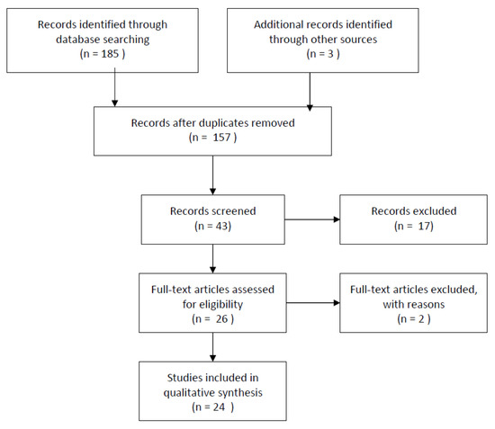 One hundred and eighty-eight records were identified and there were 157 records after exclusion of duplicates. Forty-three were screened and 26 full-text articles were assessed for eligibility. Two were excluded: one because it was a Cochrane analysis from 2015 updated in 2017, and the other because two records were based on the same data (Figure 1).
