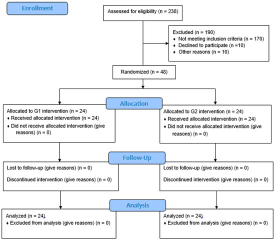 Two hundred and thirty-eight (n = 238) women classified as overweight or obese were screened for eligibility, but 190 did not meet the inclusion and exclusion criteria, resulting in a sample of 48 women. Participants were randomly assigned in the G1 (n = 24) or G2 (n = 24) group. The final sample comprised 48 women (Figure 1).