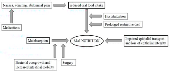 Chronic bowel inflammation or intestinal surgery may accelerate the intestinal transit. A rapid gastrointestinal transit may limit the contact time of the luminal contents with the mucosal surface, thus leading to malabsorption and resulting in greater stool volume and diarrhea. Mechanisms of malnutrition in IBD patients are depicted in Figure 1.