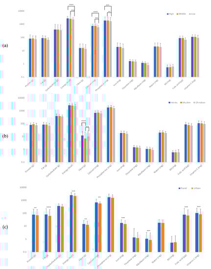 Mean nutrient intakes derived from the first FFQ across (a) income, (b) religion, (c) domicile. * Bonferroni adjusted p values. ** p < 0.005; *** p < 0.0005; **** p < 0.0001.