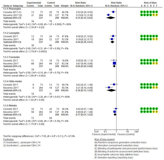 | Corsello G, 2017 (Italy) [41] | 12 to 48 mo | Healthy children, attending day care or preschool for at least 5 days a week (n = 146). | Lyophilized heat-killed L. paracasei CBA L74 vs placebo | 3 months | The rate of children experiencing at least one episode of Common infectious disease |