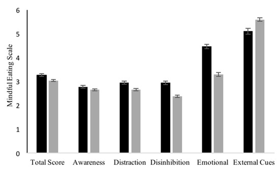Mindful Eating Questionnaire. The MEQ consists of 28 items and five subscales: Disinhibition, which assesses the individual’s ability to avoid eating when full; awareness, which assesses the individual’s awareness of texture, smell, and taste of food; external cues, which assesses the individual’s inclination to eat in response to external cues; emotional response, which assesses the individual’s tendency to eat in response to negative emotions; and distraction, which assesses the individual’s level of distraction while eating [45]. A MEQ total score and subscale scores are calculated [45].