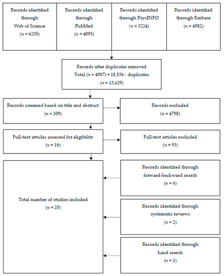 In total, 18,536 articles were found. When removing all duplicates, 4907 articles remained. Titles and abstracts were screened for eligibility. Of the 109 remaining articles, sixteen studies met the inclusion criteria. In addition, a forward and backward search was performed through which we identified six more studies. Another two articles were included after screening the reference lists of two previously published systematic reviews investigating the association between physical activity and burn-out [1,6]. One more article was obtained through hand search [46]. So, in total, 25 articles were included in the final synthesis. The flow chart of the search process is displayed in Figure 1.