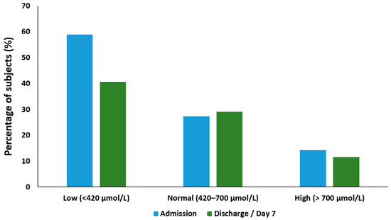 On admission, the mean plasma glutamine concentration was 464.9 ± 344.1 µmol/L (median 382.2, IQR: 280.7–572.2 µmol/L). More than half of the subjects (n = 193/330, 58.5%) had low plasma glutamine levels (<420 µmol/L). High plasma glutamine (>700 µmol/L) was found in 14.2% (n = 47/330) of subjects. The mean plasma glutamine on day 7 was 509.8 ± 543.9 µmol/L (median 418.9, IQR: 323.7–562.2 µmol/L). Expressed as a percentage of those that entered the study, 40.6% (n = 134/330) had low plasma glutamine levels on day 7, while 11.5% (n = 38/330) fell in the high plasma glutamine category. The proportion of subjects in the normal glutamine category increased slightly from 27.3% (n = 90/330) at admission to 29.1% (n = 96/330) on day 7. (Figure 1). No discharge (day 7) glutamine samples were obtained for 18.8% (n = 62/330) of subjects.