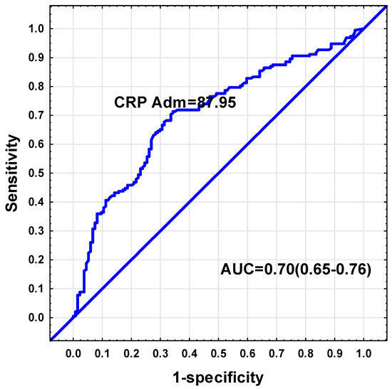 Receiver-operating characteristic (ROC) curves were used to determine which parameters (admission APACHE II, SOFA, CRP, albumin, urea, creatinine, total bilirubin, AST, ALT, LDH, and SOFA day 7) could be used to discriminate between low and sufficient admission glutamine levels. From these parameters, the only analysis with an area under the curve ≥0.7, was found for CRP. The ROC curve analysis indicated a CRP threshold value of 87.95 mg/dL to be indicative of low plasma glutamine (Sensitivity = 71%, Specificity = 66%, positive predictive value = 75%, negative predictive value = 62%, AUC = 0.70, 95% CI: 0.65–0.76, p < 0.001). (Figure 3). Of those subjects with a CRP value exceeding 87.95 mg/dL (n = 179), 75.9% had plasma glutamine levels below 420 µmol/L.