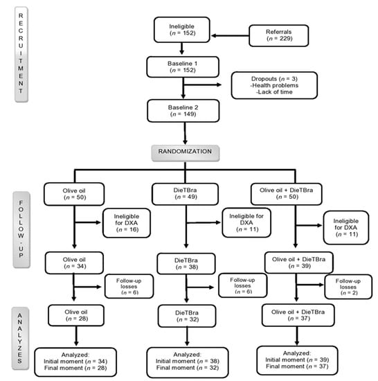 Randomization was performed in a random allocation sequence with 1:1:1 ratio, using previously described procedures [25,26,27]. Thus, 149 participants were randomized into three groups: olive oil, traditional Brazilian diet (DieTBra), and olive oil + DieTBra (olive oil + DieTBra) (Figure 1).