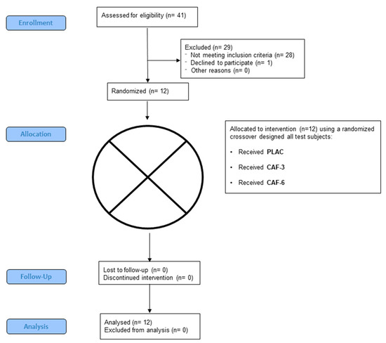 CONSORT flow diagram. n—number of participants; PLAC—placebo; CAF-3—caffeine 3mg/kg/b.m; CAF-6—caffeine 6mg/kg/b.m.