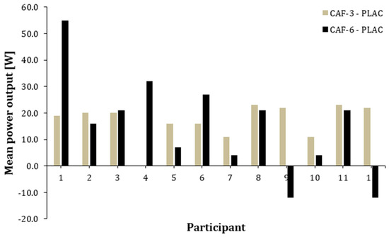 The y-axis represents the difference in mean power output during the 5 sets of BPT between PLAC–CAF-3; PLAC–CAF-6 for each individual.
