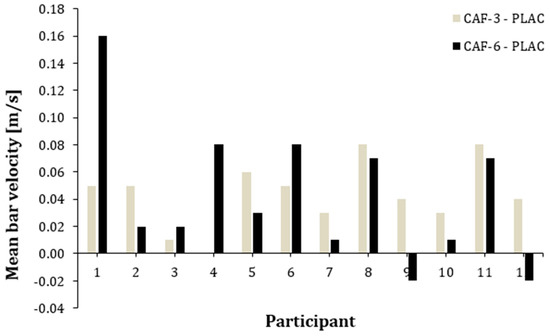 The y-axis represents the difference in mean bar velocity output during the 5 sets of BPT between PLAC–CAF-3; PLAC–CAF-6 for each individual.