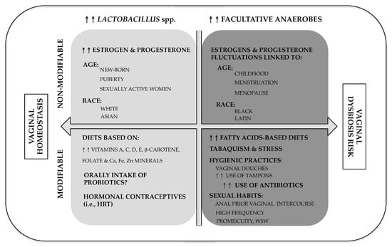 Here, in this section, the main risk factors associated with vaginal dysbiosis (VD) are reviewed. Like in other diseases, risk factors can be categorized as those inherent to the human condition (known as non-modifiable factors) and those related to social conduct or habitats, so-called modifiable factors (Figure 1).