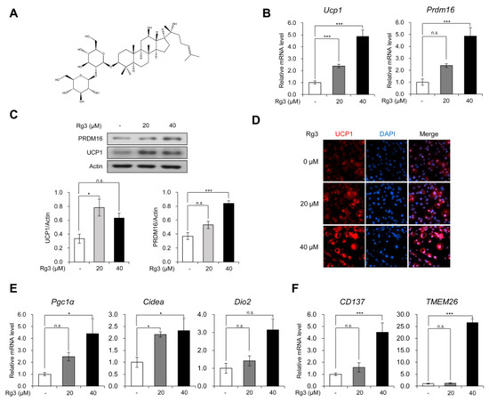 - Lee, K.; Seo, Y.-J.; Song, J.-H.; Chei, S.; Lee, B.-Y. Ginsenoside Rg1 promotes browning by inducing UCP1 expression and mitochondrial activity in 3T3-L1 and subcutaneous white adipocytes. J. Ginseng Res. 2019, 43, 589–599. [Google Scholar] [CrossRef]
