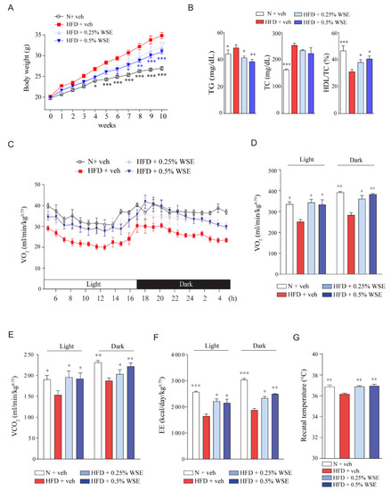 WSE prevents obesity by enhancing the oxygen consumption rate (OCR) in mice fed an HFD (high-fat diet). (A) Effect of WSE on mouse body weight during the 10 weeks experimental period. (B) Serum lipid levels. (C) VO2 levels throughout the light/dark cycle were analyzed by indirect calorimetry. The levels were normalized to body weight. (D) Area under the curve (AUC) of VO2. AUC was calculated using Prism software (ΔX*(Y1 + Y2)/2, X: Value of X axis, Y: Value of Y axis). (E) AUC of VCO2. (F) Energy expenditure was calculated based on the VO2 and VCO2 levels. (G) Rectal temperature was measured at room temperature. Data represent the mean ± SEM (n = 5). Difference between groups was evaluated by Tukey’s multiple comparison test. * p < 0.05; ** p < 0.01; *** p < 0.001 compared with the HFD group. N: Normal control diet.