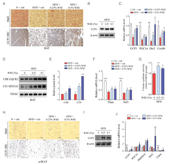 Subcutaneous WAT (scWAT) can be differentiated into beige adipocytes, which are brown fat-like cells that are induced upon exposure to prolonged cold conditions or β-adrenergic receptor activation. Beige adipocytes are rich in mitochondria and express BAT-specific proteins, such as UCP1 [27]. We investigated whether scWAT could differentiate into beige adipocytes by WSE supplementation in HFD-fed mice. WSE supplementation decreased the adipocyte size and increased UCP1 expression when compared with the levels observed in the HFD group (Figure 2H,I). WSE supplementation also significantly increased the mRNA levels of BAT-specific genes, including UCP1, PGC1α, PR domain containing 16 (Prdm16), Dio2, and Cidea, when compared with those in the HFD group (Figure 2J). These results indicated that WSE enhances the differentiation of scWAT to BAT-like adipocytes.