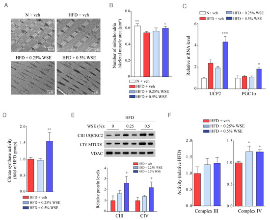 WSE improves mitochondrial function in skeletal muscle. (A) Representative transmission electron microscopic images of the skeletal muscle. (B) Number of mitochondria per skeletal muscle area. (C) Relative mRNA levels of mitochondrial-related genes in skeletal muscle. (D) Citrate synthase activity in skeletal muscle. (E) Expression of protein involved in mitochondrial complexes III and IV in skeletal muscle, and densitometry-based quantification of the data, normalized to the level of VDAC (n = 3). (F) Activity of mitochondrial complexes III and IV in skeletal muscle. Data represent the mean ± SEM (n = 5). Difference between groups was evaluated by Tukey’s multiple comparison test. * p < 0.05; ** p < 0.01; *** p < 0.001 compared with the HFD group.