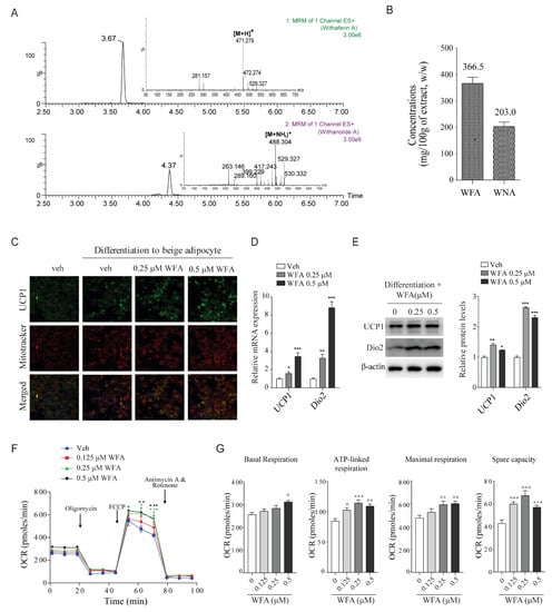 Withaferin A (WFA) in WS enhances the differentiation into beige adipocytes and increases OCR. (A) LC-MS/MS analysis of WSE. (B) Contents of WFA and withanolide A (WNA) in 100 g of WSE. (C) UCP1 expression in differentiated 3T3-L1 beige adipocytes. (D) Expression of brown adipocyte-specific mRNA in differentiated 3T3-L1 beige adipocytes. (E) WFA increases protein expressions of UCP1 and Dio2 in beige adipocytes (n = 3). (F) WFA increases the OCR in C2C12 cells. C2C12 cells were treated with the indicated concentrations of WFA for 24 h. (G) Quantification of basal respiration, ATP production, maximal respiration, and spare capacity. Data represent mean ± SD of three independent experiments. Difference between groups was evaluated by Tukey’s multiple comparison test. * p < 0.05; ** p < 0.01, *** p < 0.001 compared with the vehicle group.