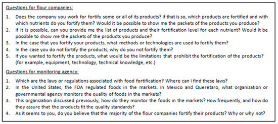 Semi-structured, open-ended exploratory questions (designed to address the research question [28]) were used to obtain relevant context information about the fortification program (see Figure 2). The content of the interview questions was reviewed by two experts (doctorates of food science with experience in conducting research in Mexico) before deploying its use in Mexico and being revised accordingly. The guiding questions (n = 5) posed for stakeholders at a food company were different from questions (n = 4) posed to the government agency because of their different roles in the program. Responses were recorded via iPhone 8 Voice Memos application (audio recording device) and hand-written field notes to capture each response to the fullest. No compensation was provided to the participants. Transcripts were read by researchers (AWW and AD) and, as no new information was obtained, data saturation was considered reached.