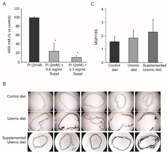 Effect of MK-7 in combination with magnesium carbonate and Sucrosomial® Iron on vascular calcification. (A) In vitro calcification of vascular smooth muscle cells was induced by 2 mM of inorganic phosphate (Pi). The effect of the supplement combination (Suppl.) was tested at 0.3 and 0.6 mg/mL. Extracellular calcium was quantified by alizarin red S (ARS) staining. (B) Representative photomicrographs of abdominal aortas stained using the von Kossa method in control (upper panels), uremic (middle panels), and supplemented uremic diets (lower panel). The images are from 5 of 11 rats examined for each group. Although there was some variability between the rats, the induction of vascular calcification was observed by the brown/black staining in the tunica media of the uremic rats compared to the controls. The supplemental diet did not significantly affect the deposition of calcium. (C) Matrix Gla protein (MGP) mRNA expression from rat aortas determined by qRT-PCR. Student’s t-test: * p < 0.05 vs. Pi (2.0 mM).