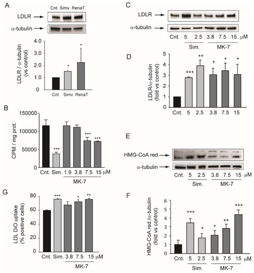 Thus, MK-7 appeared to act with a similar mechanism of action as statins, such as by inhibiting the cholesterol biosynthetic pathway thereby inducing cholesterol related genes to counteract this action. To further explore this possibility, we determined the mRNA expression levels of LDLR and HMG-CoA reductase by RT-qPCR. As shown in Figure 3, 24 h incubation with MK-7 at 7.5 µM significantly induced both genes to similar extents as the 40 µM simvastatin.