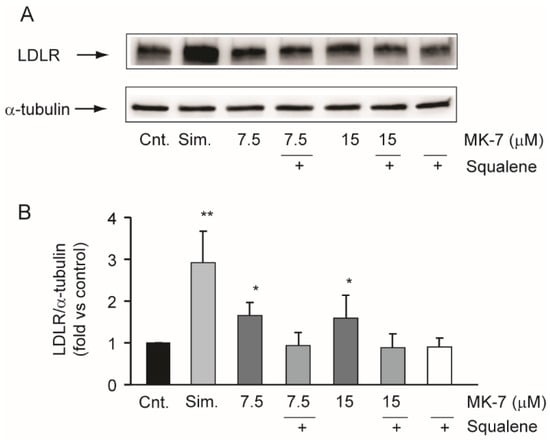 Effect of squalene on MK-7-dependent induction of LDLR. (A,B) Human hepatoma cells were incubated for 24 h with simvastatin (5 µM) and MK-7 in the presence or absence of squalene (10 µM). LDLR protein expression was evaluated by Western blot analysis. α-tubulin was used as the loading control. (B) Densitometric readings were evaluated using ImageLabTM software. Differences between treatments were assessed by Student’s t test. * p < 0.05 vs. control; ** p < 0.01; Sim.: simvastatin.