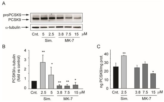 Effect of MK-7 on PCSK9 expression. (A) Human hepatoma cells were incubated for 24 h with indicated concentrations of simvastatin and MK-7. PCSK9 protein expression was evaluated by Western blot analysis. α-tubulin was used as the loading control. (B) Densitometric readings were evaluated using ImageLabTM software. (C) Cells were treated under the same experimental conditions as panel A and the conditioned media were analyzed by ELISA to determine PCSK9 concentrations. The data were normalized for the total cell protein. Differences between treatments were assessed by Student’s t test. * p < 0.05 vs. control; ** p < 0.01 vs. control; Sim.: simvastatin.