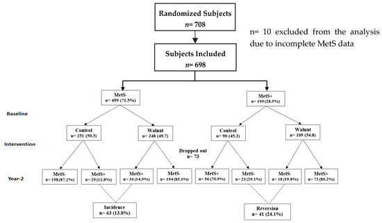 Table 2 displays the mean daily intake of energy and selected nutrients in the walnut and control groups at two years. Overall, the participants in the walnut group had significantly greater intake of total energy and all macronutrients except for total carbohydrate. As expected from the composition of walnuts, intake of dietary PUFA (i.e., ALA and LA) was significantly higher in the walnut group when compared to the control group. Figure 1 shows the classification of the development and regression rates of MetS. Evaluating the nutritional quality of study diets and examining nutrient displacement related with walnut enrichment was reported in our previous study [30].