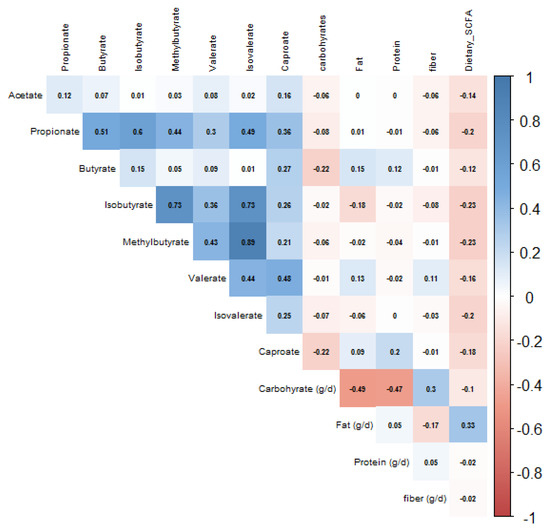 Spearman’s correlation of acetate, propionate, and butyrate with carbohydrate, fat, protein and dietary SCFA intake, n = 144.