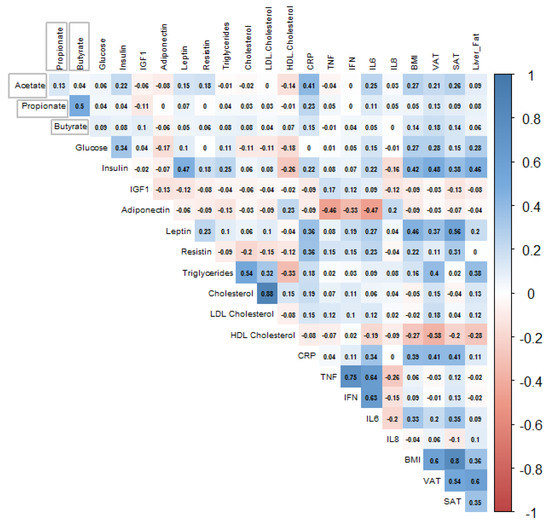 Correlations between plasma SCFA concentrations with self-reported nutrient intake and routine biomarkers are depicted in Figure 1 and Figure 2 respectively. All plasma SCFAs, except for acetate, butyrate and valerate, showed statistically significant (p < 0.05), but very weak inverse correlations with dietary SCFA intake. Acetate was positively associated with insulin, resistin, IL-6, BMI, visceral and subcutaneous adipose tissue volumes, although the correlations were very weak (r < 0.3). The only slightly stronger correlation was between acetate and CRP levels (r = 0.41).