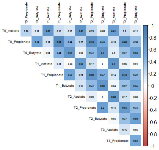 Intra-individual correlations between acetate, propionate, and butyrate concentrations at baseline (T0), week 12 (T1), 24 (T2) and 50 (T3), n = 126.