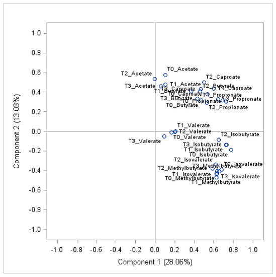 PCA plot of the first two principal components generated from all eight (8) SCFAs at four (4) different time points at baseline (T0), week 12 (T1), 24 (T2) and 50 (T3), n = 126.