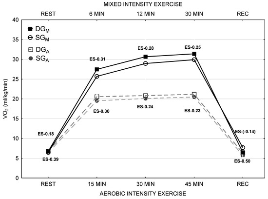 The volume of oxygen absorbed by patients from DG and SG groups during aerobic and mixed intensity exercise.
