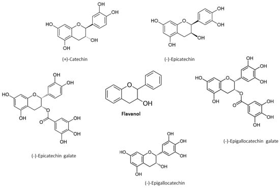 A saturated, unoxidized C ring with a hydroxyl group at C3 is common for flavanols, also known as green tea catechins. The most common catechin stereoisomers are cis ((-)-epicatechin) or trans ((+)-catechin according to C2 and C3 position in the molecule [5,24,25]. Flavanols can form gallic acid conjugates epicatechin gallate, epigallocatechin and epigallocatechin gallate during esterification with gallate groups (Figure 4) [5,24,25].