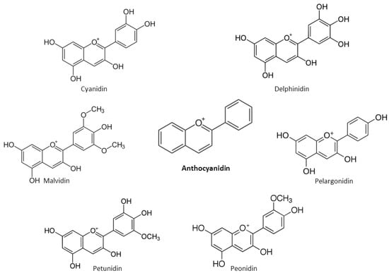 Anthocyanidins are water-soluble, unoxidized, unsaturated, flavonoids, mainly found as pH-dependent plant pigments. Anthocyanidins are based on the basic structure of the 2-phenyl-benzopyrylium chromophore–flavylium ion. They are hydroxylated at C3 position and at carbon atoms 3, 4 and 5 in the ring B of the molecule [20]. The main anthocyanidins include cyanidin, delphinidin, pelargonidin, peonidin, petunidin and malvidin (Figure 7) [20].