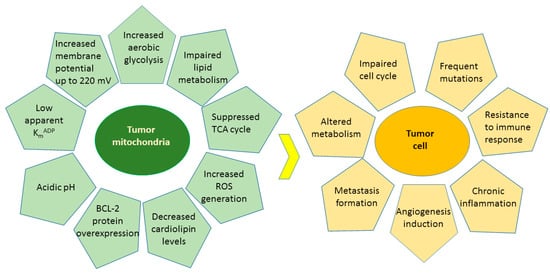 Cancer is a heterogeneous disease characterized by uncontrolled proliferation and impaired cell cycle leading to the growth of abnormal cells that invade and metastasize to other parts of the body [38,39]. Oxidative stress, hypoxia, genetic mutations and lack of apoptotic function are the main internal causes of cancer, whereas the external causes are related to increased exposure to stress, pollution, smoking, radiation and ultraviolet rays [40]. Altered metabolism, impaired cell cycles, frequent mutations, resistance to immune response, chronic inflammation, formation of metastasis, and induction of angiogenesis are the main characteristics of the cancer cells [38] (Figure 8). There is emerging evidence that cancer is a metabolic disease determined by various degrees of mitochondrial dysfunctions and metabolic alterations [38,39,41]. Mitochondria play essential roles in cellular energy supply, regulation of metabolism, cell death signaling and reactive oxygen species (ROS) generation. The main metabolic alterations of the tumor cells involve increased aerobic glycolysis [42], deregulated pH [43], impaired lipid metabolism [44], increased generation of ROS [45], and compromised enzyme activities [38,46] (Figure 8). As a direct consequence, the extracellular environment becomes acidic and more favorable to inflammation [47], glutamine-driven lipid biosynthesis increases and upregulates the pathways involved in tumorigenesis initiation and metastasis [48], cardiolipin levels decrease in membranes causing impaired enzyme activities [49,50,51], mitochondria are hyperpolarised [38], and this effect correlates with the malignancy and invasiveness of cancer cells [38].