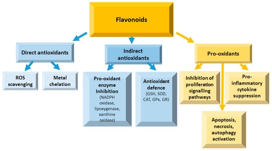 Flavonoids can directly scavenge ROS, and chelate metal ions [55] due to their ability stabilize the free radicals due to the presence of phenolic hydroxyl groups [56]. Indirect flavonoid antioxidant effects are related to activation of antioxidant enzymes, suppression of pro-oxidant enzymes, and stimulating production of antioxidant enzymes and phase II detoxification enzymes [55]. Both antioxidant and pro-oxidant activities are involved in flavonoid anticancer effects [57,58].