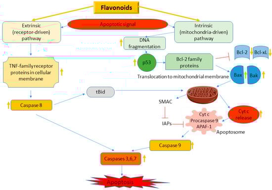 Cancer cells are resistant to apoptosis—a programmed cell death, usually induced by a series of signal transduction pathways and pro-apoptotic proteins—caspases and Bcl-2 family proteins [20,91]. There are two main signaling cascades of apoptosis—extrinsic, related to tumor necrosis factor (TNF) superfamily with main signaling protein—caspase 8; and intrinsic—mitochondrial pathway, where Bcl-2 family proteins launch the activation of caspases 9, 3 and 7 (Figure 10) [20,91]. There is an overexpression of oncogenic genes (e.g., c-Myc), leading to cellular proliferation and p53 suppression, and activated anti-apoptotic proteins of Bcl-2 family in cancer cells [92], whereas pro-apoptotic proteins and caspases could be downregulated [91,92]. Flavonoids could target apoptotic signaling cascade stimulating the cell death pathways [20,21] (Figure 10).