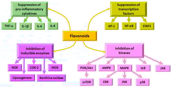 Flavonoid targets during inflammation processes. TNF—tumor necrosis factor, IL—interleukin, AP-1—activator protein 1, NF-κB—nuclear factor kappa-light- chain-enhancer of activated B cells, STAT3—signal transducer and activator 3, NOX—NADPH oxidase, COX-2—cyclooxygenase-2, iNOS—inducible nitric oxide synthase, AMPK—AMP—activated protein kinase, PI3K—phosphatidylinositide 3-kinases, Akt—protein kinase B, mTOR—mammalian target of rapamycin, MAPK—mitogen activated protein kinase, ERK—extracellular-signal-regulated kinase, JNK—c-Jun N-terminal kinase, p38—p38 kinse, IκB—IκB kinase, JAK—Janus kinase.
