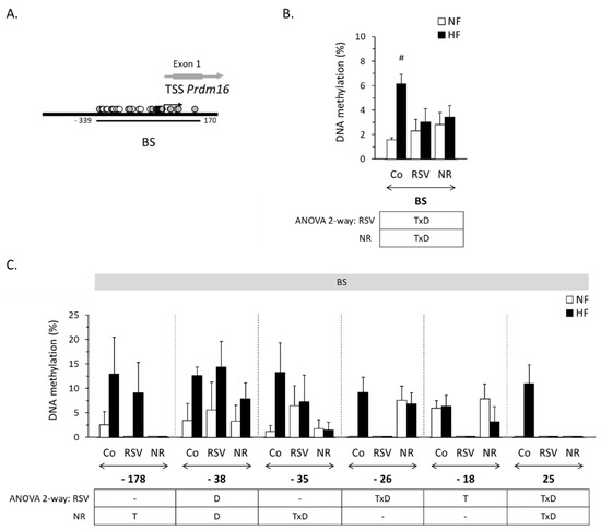 3.2. Early Life Supplementation with RSV or NR Affected the Methylation Profile of Prdm16 in iWAT of Adult Mice